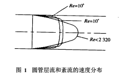 不同流動狀態(tài)的水泥漿液流經(jīng)流量計測量管時,管內(nèi)圓截面上會呈現(xiàn)不同的流速分布(見圖1),即: 層流的流速變化是拋物線分布,在管中心軸上流速*大,且雷諾數(shù)變化、流速分布形態(tài)不變;紊流時,流速分布在測量管內(nèi)壁的近旁比層流流速大,在中心部比層流時流速小,且流速分布形態(tài)隨雷諾數(shù)的變化而變化。