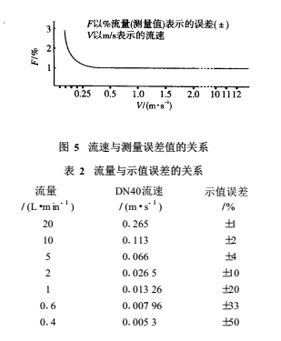 由EMF的測量原理可知,其流量的下限由同噪聲或偏移的信噪比S/N 來決定,其上限則由測量管內(nèi)襯里的磨損和配管的經(jīng)濟(jì)速度等來決定。一般當(dāng)測量管內(nèi)實際流速小于0.1m/s時,感應(yīng)電動勢已變得十分微弱(幾微伏至零點幾微伏),此時噪聲的影響逐步變?yōu)橹鲗?dǎo),甚至淹沒信號電動勢。其流速和測量誤差的關(guān)系詳見圖 5和表2。