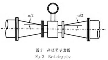 (12)當(dāng)管道內(nèi)流速偏低,工藝流量又較穩(wěn)定,為滿足儀表對流速范圍的要求,在儀表部分局部提報流速,可選擇流量計口徑小于工藝管道,并在流量計的前后加接異徑管。為了在安裝異徑管后不過多影響流場分布,不影響污水流量計的精度,要求異徑管的中心錐角α不大于15°,越小越好。這樣可把異徑管視為直管段的一部分。