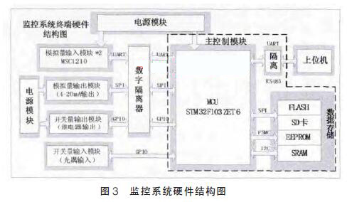 現場浮子流量計監(jiān)控系統的總體結構如圖2所示。其中硬件系統主要功能是模擬量(溫度、儀表信號)的采集,模擬量(4~20mA 電流)的輸出,開關量的輸入輸出以及遠距離RS485串行通訊和數據存儲。其中監(jiān)測系統硬件結構如圖3 所示。為增強監(jiān)測系統的抗干擾能力, 本設計采用帶隔離的電源模塊以及數字隔離器確保系統能夠高效穩(wěn)定工作。