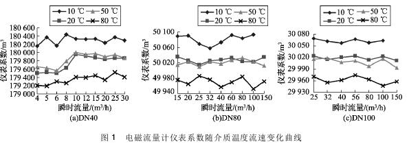 將實(shí)驗(yàn)測(cè)得的耐腐蝕排污管道流量計(jì)在不同溫度及流速下的儀表系數(shù)數(shù)據(jù)整理,特性曲線(xiàn)如圖1所示,3組曲線(xiàn)分別對(duì)應(yīng)DN40、DN80、DN100的3塊耐腐蝕排污管道流量計(jì)的儀表系數(shù)曲線(xiàn)。