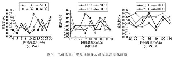 將實(shí)驗(yàn)測(cè)得的耐腐蝕排污管道流量計(jì)在不同溫度及流速下的重復(fù)性數(shù)據(jù)整理,特性曲線(xiàn)如圖2所示,3組曲線(xiàn)分別對(duì)應(yīng)DN40、DN80、DN100的3塊耐腐蝕排污管道流量計(jì)的重復(fù)性曲線(xiàn)。