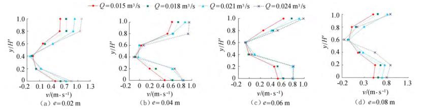 圖4橫坐標(biāo)為斷面水流方向流速,縱坐標(biāo)為測點垂向位置與下游水位的比值y/H'。隨著浮體結(jié)構(gòu)位置的上升,*小斷面流速位置同樣上升。以圖3(a)為例,當(dāng)e=0.02m時,下游斷面位置自下而上呈現(xiàn)先減小、后增大的趨勢,在y/H'=0.40時流速達(dá)到*小,隨著浮體結(jié)構(gòu)位置的上升,*小流速呈現(xiàn)向上偏移的趨勢。在斷面位置y/H'=0.20時,隨著e的增大,流速呈現(xiàn)增大的趨勢。當(dāng)e較小時,流經(jīng)浮體結(jié)構(gòu)下部進(jìn)行下泄的水流較少,主流出現(xiàn)在浮體結(jié)構(gòu)的上部,且在浮體結(jié)構(gòu)的阻擋作用下出現(xiàn)回流區(qū);隨著e上升,主流偏向浮體結(jié)構(gòu)下部區(qū)域,流速增大。與y/H'=0.20的流速分布正好相反,當(dāng)y/H'=0.80時,流速分布隨著浮體位置的增大而減小。隨著e的增大,通過浮體結(jié)構(gòu)下部泄流的水體增多,主流開始向下偏移。試驗過程中,浮體結(jié)構(gòu)處于淹沒狀態(tài),流速的分布隨著浮體位置的改變呈現(xiàn)上大、中小、下大的分布趨勢,在浮體結(jié)構(gòu)下游區(qū)域形成回流區(qū),回流區(qū)的位置隨著浮體結(jié)構(gòu)的上升而上升。