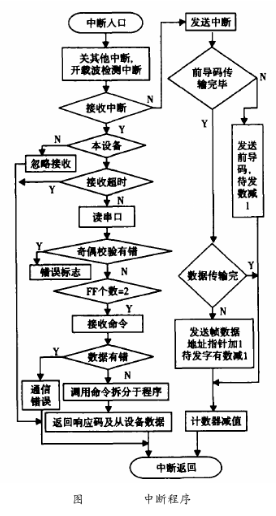 在HART通信中,地下污水流量計(jì)作為從設(shè)備進(jìn)行通訊,所以這里的軟件設(shè)計(jì)只是針對于從設(shè)備。HART通信采用水平和垂直校驗(yàn)的方法。當(dāng)檢測到接收數(shù)據(jù)有差錯(cuò)時(shí),則等到主設(shè)備命令幀發(fā)完后,通知主設(shè)備數(shù)據(jù)接收有誤。主設(shè)備則重新發(fā)命令幀,從而保證通信的準(zhǔn)確可靠。HART中斷子程序流程圖如圖6所示。由于HART通信為主從方式,HART幀中每個(gè)字節(jié)在物理層傳輸需要9ms左右,為了保證通訊的實(shí)時(shí)性,通訊程序采用串行口終端接收/發(fā)送。該中斷所要完成通信中的主要任務(wù),即接收和發(fā)送幀,幀的拆分和打包。