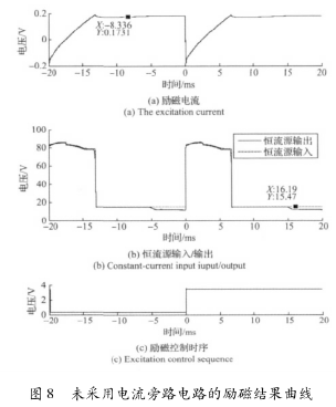 實(shí)驗(yàn)結(jié)果表明,高壓源向低壓源切換后,三端穩(wěn)壓器的工作特性致使的電流波動(dòng)和低壓源供電情況下的恒流控制,會(huì)大幅延長(zhǎng)勵(lì)磁電流的穩(wěn)態(tài)響應(yīng)時(shí)間。圖8所示勵(lì)磁電流約在17ms左右進(jìn)入穩(wěn)態(tài),圖9所示勵(lì)磁電流的穩(wěn)態(tài)響應(yīng)時(shí)間約為12ms。這表明,在采用三端穩(wěn)壓器搭建恒流控制電路的情況下,電流旁路電路能有效克服三端穩(wěn)壓器工作特性的影響,并能方便的實(shí)現(xiàn)電流超調(diào),加快勵(lì)磁電流的響應(yīng)速度。
