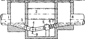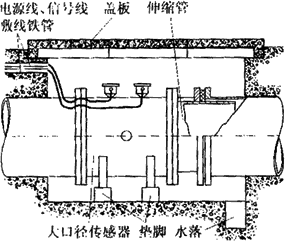 由于大口徑管道在多數(shù)場合下是埋在地下的,因此大口徑傳感器在安裝前應(yīng)做好水泥地坑。圖6-19所示是在給排水系統(tǒng)中常見的安裝形式。水泥地坑應(yīng)有足夠的活動空間,側(cè)壁埋有敷設(shè)電纜的鋼管,上有蓋板防止雨淋,下有泄水管以免坑內(nèi)積水而使傳感器侵水。為了拆裝方便,傳感器應(yīng)放在墊腳上,且在下游側(cè)裝有活絡(luò)的伸縮管。圖6-20是105%發(fā)煙硫酸流量計在地下水泥管污水排放系統(tǒng)中的安裝實例。