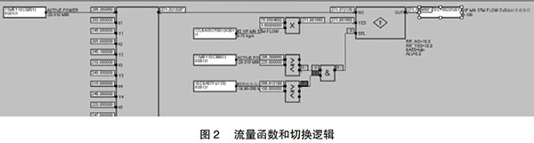 但是由于近期趨勢可能收集不到部分負(fù)荷段的相關(guān)數(shù)據(jù),在超出現(xiàn)有數(shù)據(jù)負(fù)荷的部分應(yīng)采取必要的補救措施,可以參考相同負(fù)荷運行的另一臺余熱鍋爐的主蒸汽流量,以此來彌補現(xiàn)有數(shù)據(jù)的不足。為了保證數(shù)據(jù)切換的可靠性,切換條件要嚴(yán)謹(jǐn),現(xiàn)有函數(shù)的負(fù)荷下線上增加25MW與另外一臺的燃機(jī)負(fù)荷大于100MW。如此設(shè)置的好處是當(dāng)另一臺運行機(jī)組突然故障或跳機(jī)時保證數(shù)據(jù)能及時切換到函數(shù)輸出,保證機(jī)組的安全運行。具體操作見圖2。