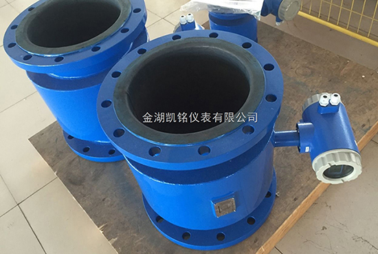 凱銘電磁流量計是以內(nèi)襯絕緣材料做為非導(dǎo)磁合金短管;兩只電極沿管徑方向穿通壁固定在測量管上,其電極頭與襯里內(nèi)表面基本齊平。勵磁線圈由雙向方波脈沖勱磁時,將在與測量管軸線垂直的方向上產(chǎn)生一磁通量密度為B的工作磁場;此時,如果具有一定電導(dǎo)率的液體流經(jīng)測量管,將切割磁力線感應(yīng)出電動勢E,電動勢E正比于磁通量密度B,測量管內(nèi)徑d與平均流速V 的乘積。電動勢E(流量信號)由電極檢出并通過電纜送至轉(zhuǎn)換器。轉(zhuǎn)換器將流量信號放大處理后,可顯示流體流量,并能輸出脈沖,摸擬電流等信號,用于流量的控制和調(diào)節(jié)。