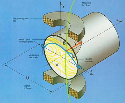 當(dāng)導(dǎo)電液體沿測量管在交變磁場與磁力線成垂直方向運(yùn)動時,導(dǎo)電液體切割磁力線產(chǎn)生感應(yīng)電勢。在與測量管軸線和磁力線相互垂直的管壁上安裝了一對檢測電極,將這個感應(yīng)電勢檢出。