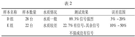 當(dāng)然除了管徑這一大因素外,污水水質(zhì)的好壞也是一個(gè)影響檢測(cè)效果的原因。把受檢的 50 臺(tái)流量計(jì)所流過(guò)的水質(zhì)分為兩組,水質(zhì)一般 D 組和水質(zhì)較差 E 組。整理數(shù)據(jù)見(jiàn)表 2。