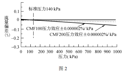 從圖2 中, 我們可以看出壓力對測量準(zhǔn)確度的影響:當(dāng)工藝壓力增大, 會使流量計產(chǎn)生一個負(fù)向偏差, 表現(xiàn)為流量顯示值比實際值偏小;當(dāng)壓力減小時, 會使流量計產(chǎn)生一個正向偏差, 表現(xiàn)為流量顯示值比實際值偏大。