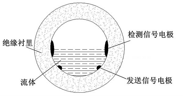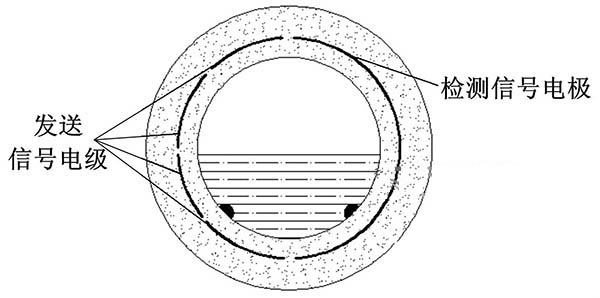 ③利用阻抗或信號(hào)衰減研制的非滿管一寸管污水流量計(jì)。這種結(jié)構(gòu)的非滿管一寸管污水流量計(jì)是當(dāng)前國(guó)內(nèi)研究的方向之一。其結(jié)構(gòu)是流量管底部貼一對(duì)信號(hào)發(fā)射電極,在流量管中間貼信號(hào)接收電極。由于信號(hào)在流體中傳播會(huì)產(chǎn)生衰減,且傳播時(shí)間越長(zhǎng),衰減越多,因此通過(guò)信號(hào)接收電極接收到的信號(hào)衰減量即可得知液面高度;同時(shí)該電極還能測(cè)量流體切割磁感線產(chǎn)生的電動(dòng)勢(shì),以此達(dá)到測(cè)量非滿管流量的目的。阻抗式或信號(hào)衰減非滿管一寸管污水流量計(jì)結(jié)構(gòu)簡(jiǎn)圖如圖5所示。
