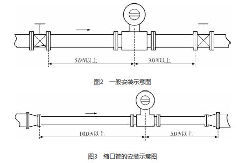 硝酸管道流量計的安裝質(zhì)量對其測量結(jié)果的影響較大,因此在安裝時需要注意幾個問題。*先,硝酸管道流量計直管段的選擇在配管時一定要按照要求進(jìn)行選擇,一般選擇流量計通徑與工藝管道通徑相同,即可滿足工程需要,而且安裝方便、壓力損失小,流量計直管段上游側(cè)的長度不少于5倍工藝管道直徑,下游側(cè)的長度不少于3倍工藝管道直徑(圖2)。但在流速太慢而又要求精度較高或需要變徑的應(yīng)用場合,可選擇通徑小于工藝管道通徑的流量計,以提高測量精度,此時流量計上、下游必須加裝異徑管,且進(jìn)口異徑管上游側(cè)應(yīng)有長于10倍工藝管道直徑的直管段,下游側(cè)應(yīng)有長于5倍工藝管道直徑的直管段(圖3)。