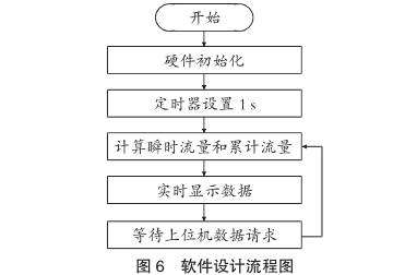 上電后程序?qū)SP的硬件資源進(jìn)行初始化,包括中斷系統(tǒng)、GPIO口、定時(shí)器/計(jì)數(shù)器、通信端口及基本的時(shí)鐘設(shè)置。程序每秒對(duì)接收到的脈沖進(jìn)行計(jì)數(shù),其除以?xún)x表系數(shù)后的結(jié)果作為瞬時(shí)流量,同時(shí)在時(shí)間上對(duì)瞬時(shí)流量進(jìn)行累積,計(jì)算出兩種流量后,將其實(shí)時(shí)顯示在液晶顯示屏上,同時(shí)將數(shù)據(jù)保存,**等待上位機(jī)電腦對(duì)數(shù)據(jù)的讀取。通信采用MODBUS協(xié)議,波特率為9600b/s,無(wú)校驗(yàn),8位數(shù)據(jù)位,1位停止位。圖6為微處理器功能設(shè)計(jì)流程圖。