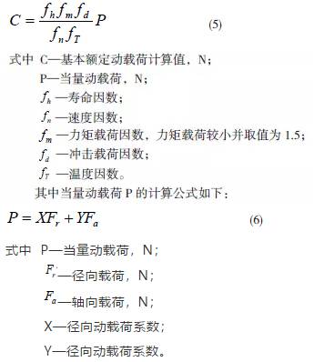 將選型軸承的參數(shù)代入(5)、(6)中直接得出基本額定動載荷C,而選型軸承的動載荷Cr 必須大于基本額定動載荷C 才能滿足設(shè)計要求。