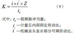 根據(jù)實際流量計的所測得儀表系數(shù)K 更換對應(yīng)齒輪傳動比,使機械表頭顯示部分和齒輪轉(zhuǎn)動發(fā)出低頻脈沖輸出均與高頻脈沖輸出匹配,實際三者關(guān)系如下: