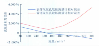 從以上數(shù)據(jù)表和曲線圖中可以看出:空氣流量計型號一定的情況下,用表體取壓孔取壓方式檢定流量計時流量計的線性度較好,用管道取壓孔取壓方式檢定流量計時流量計的線性度較差;流量測點相同的情況下,表體取壓孔取壓檢定方式的流量計誤差較小,管道取壓孔取壓檢定方式的流量計誤差較大;兩種取壓方式引起的誤差隨著流量的增大而逐漸增大,在流量為2?。梗埃埃恚常钑r兩者相差近6.2%,遠遠超出了流量計的準(zhǔn)確度等級。所以,在空氣流量計的檢定過程中,應(yīng)避免在流量計表體取壓孔以外的地方取壓進行檢定。