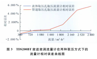 例,系統(tǒng)運行時間為60s,標(biāo)準(zhǔn)裝置的滯止平均溫度為29.7℃,空間平均濕度為42%,流量計的平均溫度為29.3℃,在表體取壓孔取壓和管道取壓孔取壓的流量計檢定試驗數(shù)據(jù)分別如表3、4所示。兩種取壓方式下的流量計相對誤差曲線如圖3所示。