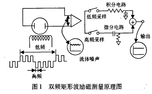 雙頻矩形波勵磁測量原理如圖l所示,一個由高低頻分量迭加而成的電磁場通過勵磁線圈被施加到被測液體中,勵磁波形是在一個低頻矩形波上迭加一個高于市電頻率的矩形波而得到的波形。在產生的電動勢中,低頻分量通過一個大時間常數(shù)的積分電路獲得一個零點穩(wěn)定性好的平穩(wěn)流量信號。而由漿液或低電導率流體產生的低頻噪聲可被不受噪聲影響的高頻采樣電路所抑制,有著同樣時間常數(shù)的流量信號經過一個差分電路以確定流速信號的變化,把這兩種不同頻率采樣所得的信號結合起來可獲得一個穩(wěn)定流速信號,該信號不受噪聲干擾,且有較高的零點穩(wěn)定性。