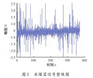 針對管道式水流量計測量水煤漿時出現(xiàn)較大波動,甚至回零這一問題,特去某煤化工企業(yè)甲醇分公司進行現(xiàn)場數(shù)據(jù)采集。該公司所使用的對置式四噴嘴氣化有4個噴嘴,噴嘴管道口徑為125mm,管中水煤漿流量基本穩(wěn)定在19m³/h(流速約為0.48m/s)。每條噴嘴煤漿線上安裝了3臺管道式水流量計,每臺管道式水流量計由傳感器和變送器兩部分組成。選擇其中1條水煤漿管線上的1臺管道式水流量計進行數(shù)據(jù)采集,因為該臺管道式水流量計測量結(jié)果波動大,甚至出現(xiàn)回零的現(xiàn)象。將課題組研制的基于DSP的電磁流量變送器的信號線和勵磁線接到該電磁流量傳感器的電極和勵磁線圈上,組合成完整的管道式水流量計,進行水煤漿數(shù)據(jù)采集。使用的電磁流量變送器是以TI公司DSP芯片TMS320F28335為核心,采用高頻勵磁方案,其硬件主要包括勵磁控制系統(tǒng)和信號采集處理系統(tǒng),具體的模塊有勵磁驅(qū)動模塊、信號調(diào)理采集模塊、信號處理控制模塊、人機接口模塊、通信模塊及電源管理模塊。信號調(diào)理采集模塊中的調(diào)理電路對一次儀表輸出的信號進行放大和濾波,截止頻率是2kHz,放大倍數(shù)約為230倍。通過NI公司USB-6216型號的數(shù)據(jù)采集卡進行數(shù)據(jù)采集,把調(diào)理電路的輸出端連接到數(shù)據(jù)采集卡的一個差分輸入端,并設(shè)置數(shù)據(jù)采集卡工作在差分的測量模式,設(shè)置采集卡的采樣頻率為10kHz。采集多組水煤漿信號數(shù)據(jù),每組數(shù)據(jù)的時間長度為5min。