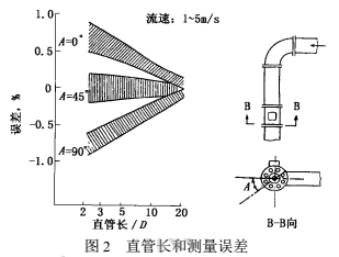 2000年上海原水公司擬在已建成的某泵站加裝DN2200液蠟流量計,但彎管下游安裝位置的前直管長度明顯不符合規(guī)定中5D~10D(D為管徑,下同)的要求,此時,影響測量誤差有多大呢?