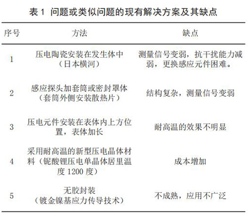 3) 當(dāng)前技術(shù)系統(tǒng)存在的問(wèn)題。 由于目前使用的傳感器檢測(cè)感應(yīng)元件為壓電陶瓷,其極化時(shí)居里溫度大約420 ~ 460℃,因此只能在低于 240℃介質(zhì)中使用,一旦被測(cè)量介質(zhì)的溫度高于 240℃,二氧化硫流量計(jì)傳感器便會(huì)因壓電陶瓷達(dá)到居里點(diǎn),絕緣電阻降低,壓電信號(hào)變?nèi)醵А?br /> 4)問(wèn)題或類似問(wèn)題的現(xiàn)有解決方案及其缺點(diǎn)(見表 1)。