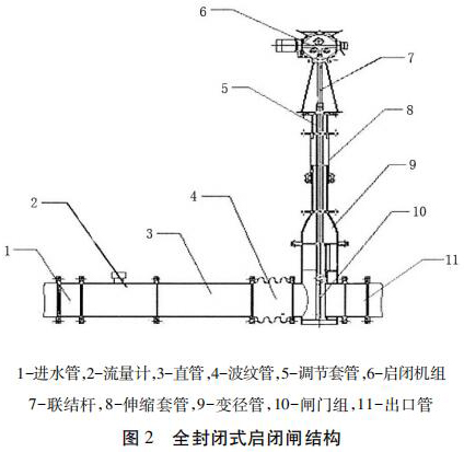 包括進水管、直管、出水管、過熱蒸汽流量計組和啟閉機組,進水管、直管、出水管從左到右依次連接,過熱蒸汽流量計組安裝在直管和出水管之間且位于出水管的入口處,過熱蒸汽流量計組通過聯(lián)結(jié)桿與啟閉機組的輸出端連接。為防止泥沙淤積影響啟閉,過熱蒸汽流量計采用閘板式啟閉結(jié)構(gòu)。密封式啟閉閘為整體封閉管道式,全部采用不銹鋼材料,水流通過管道流出讓整個閘井內(nèi)干燥無水。伸縮套管與波紋管的設(shè)計讓檢修與清理淤泥更加方便。過熱蒸汽流量計裝有荷載限制器,其布置受力明確、結(jié)構(gòu)緊湊、動作可靠。當(dāng)?shù)蹙呱系暮奢d達到額定值的 110%時,或電機電流超過額定電流 150%時,系統(tǒng)自動切斷操作電源以保護設(shè)備安全。