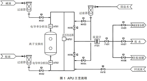 整個(gè) APU 都是通過(guò) PLC 程序自動(dòng)控制的。程序通過(guò)控制閥門的開關(guān)使不同的液體按順序進(jìn)入離子交換柱,使離子交換柱中的液體按順序排出。