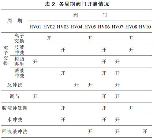 5)回流沖洗周期。 胺液每天都需取樣化驗(yàn),如果發(fā)現(xiàn)胺液中有不溶或懸浮的過(guò)渡金屬聚集,則每天運(yùn)行周期結(jié)束后需利用回流液對(duì)樹脂進(jìn)行清洗,以防止腐蝕和樹脂損壞。 如果選擇了此選項(xiàng),PLC程序會(huì)在每天完成目標(biāo)數(shù)量的離子交換周期后,自動(dòng)執(zhí)行回流液清洗周期。 各周期閥門對(duì)應(yīng)開關(guān)情況,如表 2 所示。