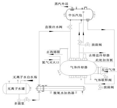 來自無離子水罐的脫氧水經(jīng)多經(jīng)泵加壓、經(jīng)脫氧水加熱器加熱后進入到煤氣流量計的水段,脫氧水與反應(yīng)氣體換熱后分兩路:一路進入中壓汽包,保證汽包有穩(wěn)定的液位;一路進入熔鹽冷卻器帶出熔鹽攜帶的反應(yīng)熱。來自中壓汽包的高溫水經(jīng)管路接至煤氣流量計汽段底部,高溫水與反應(yīng)氣體換熱后產(chǎn)生高壓蒸汽,高壓蒸汽又返回中壓汽包。汽包還有一路直接注水管路,此路水不經(jīng)過煤氣流量計水段,而是直接進入汽包。在煤氣流量計出口溫度偏低而汽包液位也比較低時,可開此直接注水管路來穩(wěn)定汽包液位。其詳細(xì)流程圖如圖 2。
