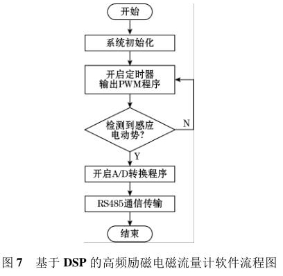 軟件流程圖如圖7 所示。軟件采用模塊化的設計方法,主要設計了勵磁控制切換程序、PWM 波產(chǎn)生程序、A/D 轉(zhuǎn)換程序以及 RS485 通信程序等。系統(tǒng)上電后*先執(zhí)行復位操作,利用 DSP 內(nèi)部的定時器產(chǎn)生PWM 波控制 H 橋電路中的勵磁方式,當系統(tǒng)檢測到傳感器線圈輸出的感應電動勢后,利用 DSP 內(nèi)部的 12位 A/D 轉(zhuǎn)換器對此信號進行模數(shù)轉(zhuǎn)換,*后根據(jù)相應算法計算出管道中被測液體的流量。