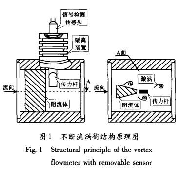 不斷流渦街同樣是以卡門渦街原理為依據(jù)測(cè)量流體流速的,但不斷流渦街表體已經(jīng)在結(jié)構(gòu)上有了質(zhì)的改變。如圖1所示,它將普通渦街單一的信號(hào)檢測(cè)傳感頭改變?yōu)閭髁U與信號(hào)檢測(cè)傳感頭兩部分,并通過(guò)隔離裝置完全隔離。當(dāng)表體中流過(guò)流體并產(chǎn)生漩渦時(shí),由傳力桿檢測(cè)漩渦的變化,并以力的形式傳遞給信號(hào)檢測(cè)傳感頭,完成了力信號(hào)到電信號(hào)的轉(zhuǎn)換過(guò)程。雖然傳力桿與流體直接接觸,但其本身只是進(jìn)行力傳輸?shù)母軛U,因此,只對(duì)外形尺寸及鋼材選擇上具有要求。而信號(hào)檢測(cè)傳感頭是通過(guò)隔離裝置與流體完全密閉隔離的,再加上隔離裝置本身具有的散熱功能,使得信號(hào)檢測(cè)傳感頭的使用溫度要遠(yuǎn)遠(yuǎn)低于流體的實(shí)際溫度,從而有效地提高了普通信號(hào)檢測(cè)傳感頭的可測(cè)介質(zhì)溫度。同時(shí),不斷流渦街在進(jìn)行維修更換信號(hào)檢測(cè)傳感頭時(shí),并不影響工藝管道內(nèi)流體的流動(dòng),真正實(shí)現(xiàn)了信號(hào)檢測(cè)傳感頭的不斷流拆裝維護(hù)。
