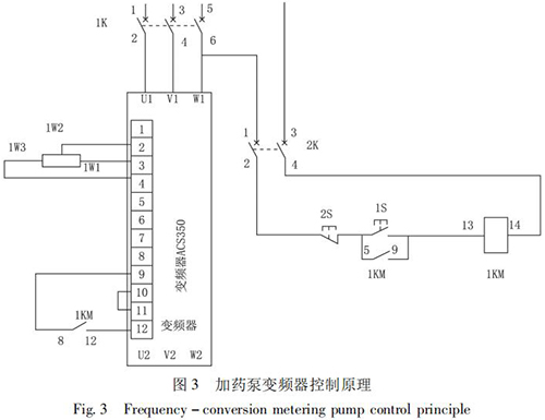 STD - Ⅲ型浮選工藝參數(shù)自動測控系統(tǒng)通過雙膜盒差壓計測量原礦漿濃度; 采用高壓泥漿流量計測量原礦漿流量,由 PLC 計算出入浮干煤泥量和藥劑的瞬時添加量,用變頻式計量泵完成浮選藥劑的添加。通過上位機還可以打印小時、班、天及月的運行數(shù)據(jù),更加有利于生產(chǎn)管理及技術(shù)分析,藥劑自動原理如圖 2 所示,k1、k2、k3 是計算修正參數(shù)。以 PID 算法為核心,通過優(yōu)化控制程序計算出藥劑給定量,在捕收劑和起泡劑管道上分別安裝藥劑測量裝置,用于檢測藥劑的添加量。當(dāng)藥劑測量值小于藥劑給定量時,PID 輸出增大,反之則減小。加藥泵變頻器控制原理如圖 3 所示。