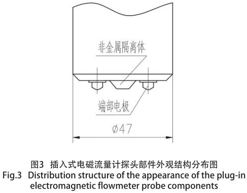 通過大量的試驗,對探頭端部外型結構亦采用特殊設計,從而消除兩個電極之間的擾流現(xiàn)象,同時亦消除因通電產生磁場,導致兩個電極吸附介質中的鐵屑而影響測量精度和死區(qū)效應,增強了輸出信號的穩(wěn)定性,從而提高傳感器準確度和抗干擾性。通過結構的優(yōu)化設計,使用壽命更長,dn80泥漿流量計探頭局部,如圖 3 所示。