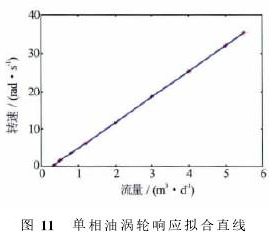 采用同樣的方法,對單相油條件下渦輪響應(yīng)規(guī)律進(jìn)行研究(見圖11),測得單相油的啟動排量為0.08m3/d。對單相油的實驗結(jié)果進(jìn)行擬合,可得單相油的響應(yīng)曲線為ω=6.73Q-6.72。與水對比而言,油的擬合曲線斜率更大,即隨著流量增加轉(zhuǎn)速增加得略快。