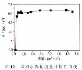 可以看出,渦輪啟動后*先進(jìn)入一個非線性段,在非線性相應(yīng)段,K值隨著流量增加而增大;當(dāng)流量比較大(單相水超過0.5m3/d,單相油超過1m3/d)時,渦輪進(jìn)入線性段,在線性響應(yīng)段,K值達(dá)到峰值,有相對較小的波動。