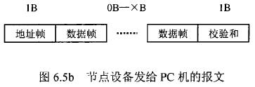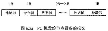 在插入式電磁流量計(jì)等節(jié)點(diǎn)設(shè)備和C機(jī)通信的過程中,由地址幀、命令幀、數(shù)據(jù)幀、校驗(yàn)和可組成各種功能不同的報(bào)文。由于采用主從工作方式來實(shí)現(xiàn)通信,插入式電磁流量計(jì)等節(jié)點(diǎn)設(shè)備僅能接收并執(zhí)行PC機(jī)發(fā)送來的控制命令,而不能發(fā)送命令給PC機(jī)。因此,由PC機(jī)發(fā)往流量計(jì)等節(jié)點(diǎn)設(shè)備的報(bào)文一般包括一個(gè)地址幀,一個(gè)命令幀,若干個(gè)數(shù)據(jù)幀和一個(gè)校驗(yàn)和,其報(bào)文格式圖.6a5所示;而由流量計(jì)等節(jié)點(diǎn)設(shè)備發(fā)往PC機(jī)的報(bào)文一般包括一個(gè)地址幀,若干個(gè)數(shù)據(jù)幀和一個(gè)校驗(yàn)和,其報(bào)文格式如圖6.5b所示。