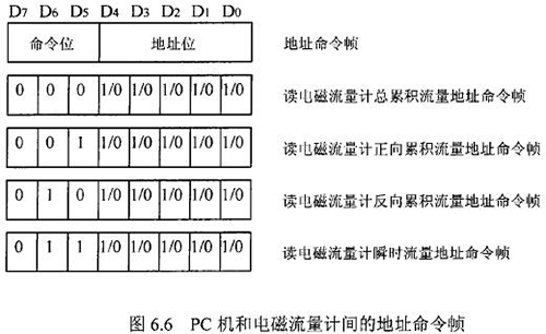 由于RS一485電氣標(biāo)準(zhǔn)規(guī)定每段只能聯(lián)結(jié)犯個(gè)節(jié)點(diǎn)設(shè)備,因此可用地址幀中五個(gè)二進(jìn)制位表示這32個(gè)地址,其余3位用來表示命令,從而構(gòu)成地址命令幀。對于控制命令需求不超過八個(gè)的通信系統(tǒng),采用地址命令幀可壓縮報(bào)文長度提高通信效率。在污水網(wǎng)絡(luò)監(jiān)控系統(tǒng)中,插入式電磁流量計(jì)和PC機(jī)通信的主要目的是將流量計(jì)中的有用數(shù)據(jù)讀到PC機(jī)中。這些數(shù)據(jù)包括:總累積流量、正向累積流量、反向累積流量、瞬時(shí)流量。通信時(shí),PC機(jī)只需向插入式電磁流量計(jì)發(fā)送讀總累積流量、讀正向累積流量、讀反向累積流量、讀瞬時(shí)流量命令即可,因此二者間通信所用的地址幀和命令幀可合二為一,用一個(gè)地址命令幀代替。PC機(jī)和插入式電磁流量計(jì)間的地址命令幀定義如圖.66所示。根據(jù)污水網(wǎng)絡(luò)監(jiān)控系統(tǒng)中PC機(jī)與插入式電磁流量計(jì)間通信的特殊性,二者通信所使用的報(bào)文可簡化為圖.67的格式。