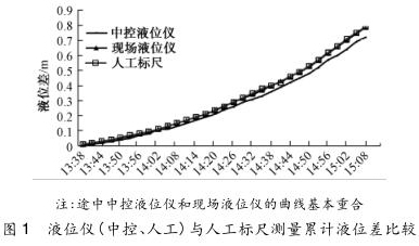 液位的測量是整個(gè)容積法校驗(yàn)的重點(diǎn),其準(zhǔn)確度直接關(guān)乎計(jì)量結(jié)果。由于液位儀信號(hào)非數(shù)字傳輸,在測量過程中安裝了人工標(biāo)尺這一液位簡易測量裝置,供校核液位儀使用。將測量的累計(jì)液位差同液位儀(中控、現(xiàn)場)測得數(shù)據(jù)進(jìn)行比較,如圖 1 所示。