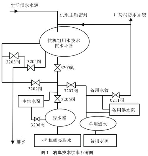 大化電廠技術(shù)供水包括右岸和左岸供水,本文以右岸 3 號(hào)機(jī)技術(shù)供水系統(tǒng)增設(shè)帶現(xiàn)場(chǎng)顯示智能型電磁流量計(jì)技術(shù)改造方案為例進(jìn)行分析說(shuō)明。右岸技術(shù)供水系統(tǒng)(見(jiàn)圖 1)由各機(jī)組單元蝸殼取水主水源、濾水器、主供水泵、正反向切換閥(3202 閥與 3204 閥開(kāi)為反向取水,3203 閥與 3205閥開(kāi)為正向取水,運(yùn)行時(shí)只開(kāi)其中一種)、備用水源、備用濾水器、備用供水泵和備用總水管構(gòu)成一個(gè)整體,并通過(guò) 0211 閥與廠房消防水系統(tǒng)相連接,可通過(guò)主水源自流供水、主水源水泵增壓供水、備用水源自流供水、備用水源水泵增壓供水等不同供水方式向機(jī)組推力軸承冷卻器和發(fā)導(dǎo)軸承冷卻器、水導(dǎo)軸承冷卻器、發(fā)電機(jī)空氣冷卻器提供冷卻水源。機(jī)組技術(shù)供水正常運(yùn)行采用單元蝸殼取水的供水方式運(yùn)行,以備用水源供水為輔。機(jī)組主軸密封用水分別取自生活供水水源和技術(shù)供水備用總管水源,向機(jī)組大軸提供可調(diào)水壓端面密封水源。在現(xiàn)場(chǎng)配置一個(gè)技術(shù)供水現(xiàn)地單元柜,實(shí)現(xiàn)對(duì)機(jī)組技術(shù)供水系統(tǒng)設(shè)備自動(dòng)控制、故障保護(hù)及報(bào)警。柜內(nèi)配置可編程 PLC 控制系統(tǒng),電控柜對(duì)主供增壓泵、3202 至 3208 電動(dòng)碟閥進(jìn)行流程控制。