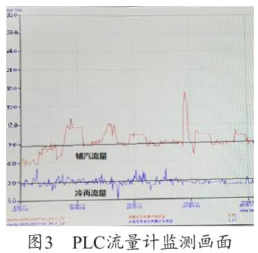 通過圖3 PLC 流量計監(jiān)測畫面可以看出,PLC 上輔汽測量用的氣體流量計的量程設(shè)置為30t/h,現(xiàn)場設(shè)備量程實際為6t/h,兩者嚴重不符,因此測量值4t/h 為錯誤值(單臺機組運行),需要對程序進行修改。
