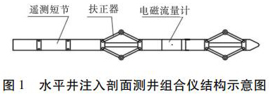 水平井注入剖面測(cè)井組合儀是針對(duì)水平井籠統(tǒng)注水井注入剖面測(cè)井專門研制的,儀器結(jié)構(gòu)如圖 1 所示。井下儀器主要包括通用短節(jié)( 遙測(cè)、溫度、壓力和 CCL) 、硫酸銅流量計(jì)和滾輪式扶正器。測(cè)量參數(shù)包括流量、溫 度、壓力、自然伽馬和深度。流量計(jì)采用的是非集流硫酸銅流量計(jì)和集流型硫酸銅流量計(jì),對(duì)于注入量較大的井采用非集流硫酸銅流量計(jì),注入量較小的井采用集流型硫酸銅流量計(jì),測(cè)量方式采用定點(diǎn)測(cè)量。儀器采用遙測(cè)技術(shù)實(shí)現(xiàn)了多參數(shù)同時(shí)測(cè)量和傳輸,儀器外徑 38 mm,耐壓80 MPa,耐溫150 ℃,流量測(cè)量范圍為1 ~ 800 m3 /d,測(cè)量精度 ± 5% 。