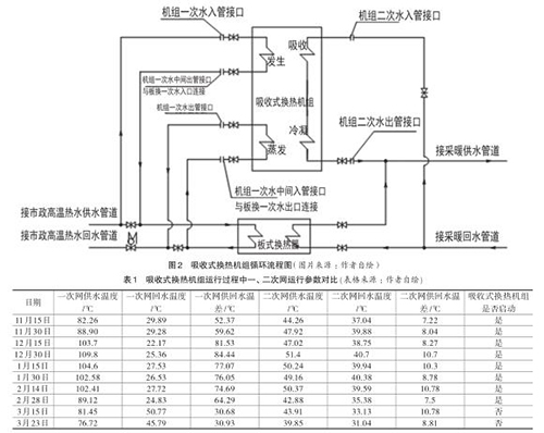 此熱力站高溫渦街流量計的一次網設計供回水設計溫度為 :120℃ /36℃,二次網設計供回水溫度為 :80℃ /60℃。在高溫渦街流量計工作流程中(見圖2),高溫熱源(即一次網供水)先進入高溫渦街流量計,發(fā)生器作為驅動熱源,換熱后進入板式換熱器,經板式換熱器換熱后的低溫水再次回到高溫渦街流量計的蒸發(fā)器,放熱至36℃后返回電廠。熱用戶的二次網回水并聯后分別進入高溫渦街流量計吸收器和板式換熱器,在吸收器和冷凝器及板式換熱器中分別進行熱交換,然后一起供給熱用戶。上述過程就是在高溫渦街流量計啟動時,熱力站內的實際供熱流程,在供暖季的初期和末期,可以關閉高溫渦街流量計,仍然利用板式換熱器單好換熱。