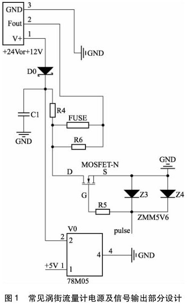 從圖1 中可以看到,供電電源 +24 V, +12 V均可,直流電源通過瓷片電容 C1 濾掉部分紋波,然后通過線性穩(wěn)壓芯片 78M05,得到 + 5 V 電壓,為后面的流量計(jì)信號(hào)處理電路供電,若要再得到 3. 3 V 電壓,通常會(huì)在 78M05 后再加一片線性穩(wěn)壓芯片 LM1117-3. 3,為了節(jié)約成本,供電電路沒有做 EMS 設(shè)計(jì)。同時(shí),脈沖輸出部分,僅通過一個(gè) MOS 管和兩個(gè)穩(wěn)壓管,也沒有 EMS 方面的設(shè)計(jì)考慮。