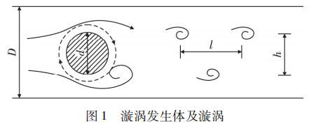 流量計(jì)是由漩渦發(fā)生體、頻率檢測(cè)器和信號(hào)轉(zhuǎn)換器等環(huán)節(jié)組成,輸出 4 ~ 20 mADC 信號(hào)或脈沖電壓信號(hào)。其測(cè)量原理是在流動(dòng)的流體中的垂直流動(dòng)方向安放 1 根或多根非流體型阻流體,在一定的流量范圍內(nèi),流體在阻流體兩側(cè)交替地分離、釋放出 2 串頻率正比于管道內(nèi)的平均流速、規(guī)則的、不對(duì)稱有規(guī)律的交替漩渦列,如圖 1 所示,且兩側(cè)漩渦旋轉(zhuǎn)方向相反。采用檢測(cè)元件測(cè)出漩渦頻率就可以推算出流體的流量。