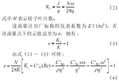 式中q表示體積流量,m3/s;ν表示介質(zhì)的運(yùn)動(dòng)黏度,m2/s;雷諾數(shù)Re=4q/(πdν);d表示流量計(jì)口徑,m;ρ表示介質(zhì)的密度,kg/m3;C'D、C'B0、C'B1和C'B2分別表示4個(gè)待定系數(shù),在某個(gè)流量點(diǎn)下標(biāo)定出的儀表系數(shù)(Kf,表示單位體積流體通過(guò)流量計(jì)時(shí),流量計(jì)輸出的脈沖數(shù),1/m3)和轉(zhuǎn)子葉片頻率(f,s-1)的關(guān)系為: