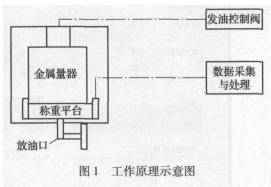 本裝置采用容積法和稱重法相結(jié)合的工作原理。對于質(zhì)量流量計,采用稱量法直接比較,確定流量計的誤差。上裝放油閥防溢出控制系統(tǒng),采用液位動態(tài)監(jiān)視,一旦超過容器安全液位高度,即可切斷發(fā)油動力。在運輸防震或非測量狀態(tài)時,對秤進行與稱重容器的脫離操作,保證稱重的可靠性。在稱重狀態(tài)時,需要對枰進行調(diào)平和清零,此部分采用動態(tài)水平的方式進行,即以水平位一致的方法調(diào)整稱重平臺。工作原理如圖1所示。