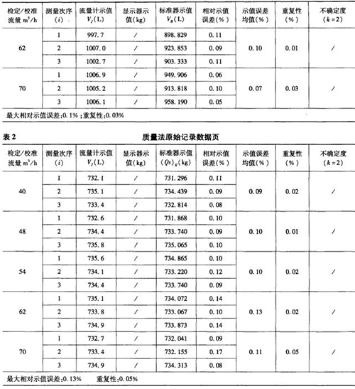 表1是用容積法現(xiàn)場檢測流量計后,電腦自動生成的原始記錄數(shù)據(jù)頁部分,表2是用質(zhì)量法現(xiàn)場檢測流量計后,電腦自動生成的原始記錄數(shù)據(jù)頁部分。