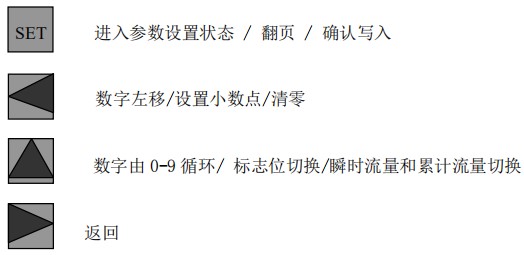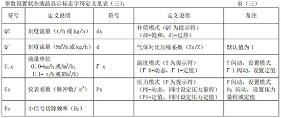 (3)標(biāo)況流量計(jì)算公式(若補(bǔ)償后單位為 U.0):(4)標(biāo)況流量計(jì)算公式(若補(bǔ)償后單位為 U.1):注:標(biāo)況指 20℃,1 標(biāo)準(zhǔn)大氣壓三、一體化液晶顯示表頭參數(shù)設(shè)置操作說明(V03Z)1、鍵盤按鍵說明2、 顯示窗字符說明注:表中 x 代表“0”或“1”;Zn:標(biāo)準(zhǔn)狀態(tài)下(20℃,1 標(biāo)準(zhǔn)大氣壓),被測氣體的壓縮系數(shù),Z:工作狀態(tài)下被測氣體的壓縮系數(shù)3、 操作說明3.1、本儀表表頭采用自導(dǎo)引式和菜單式相結(jié)合的參數(shù)設(shè)置方式,所謂自導(dǎo)引式參數(shù)設(shè)置方式就是用戶在進(jìn)入菜單 00 項(xiàng)后,表頭中的微電腦會(huì)自動(dòng)導(dǎo)引用戶去設(shè)置需要設(shè)置的參數(shù)。另外,用戶也可以通過菜單模式分別對各組參數(shù)進(jìn)行設(shè)置。蒸汽測量菜單框圖如下:3.2、參數(shù)設(shè)置約定:在設(shè)置各項(xiàng)參數(shù)時(shí),提示符閃動(dòng)代表該項(xiàng)參數(shù)沒有設(shè)置完或者尚未確認(rèn),可以通過按SET 鍵來確認(rèn)或者按→鍵退出;提示符不閃動(dòng)代表該項(xiàng)參數(shù)已設(shè)置完并確認(rèn),此時(shí)可以通過按 SET 鍵翻頁或者按→鍵退出。進(jìn)入?yún)?shù)設(shè)置時(shí),需要輸入密碼(6 位)并確認(rèn)進(jìn)入,為了防止誤進(jìn)入?yún)?shù)設(shè)置菜單,保證儀表正常工作,在設(shè)置密碼時(shí),使用↑鍵調(diào)數(shù)時(shí)不能循環(huán)調(diào)數(shù),只能單次調(diào)數(shù),只有密碼輸入正確進(jìn)入各項(xiàng)參數(shù)設(shè)置菜單后才可以對各位循環(huán)連續(xù)調(diào)整數(shù)據(jù)。3.3、儀表參數(shù)設(shè)置舉例:儀表出廠前各項(xiàng)參數(shù)已設(shè)置好,用戶無需設(shè)置。如果用戶需要設(shè)置某項(xiàng)參數(shù),請參照以下步驟,例如修改刻度流量值 QT:在工作狀態(tài)下,按 SET 鍵,顯示屏顯示 P,數(shù)字位為全零,8 秒鐘若無操作,自動(dòng)返回工作狀態(tài)。輸入密碼 :按數(shù)字↑鍵和左移←鍵,輸入密碼數(shù) xxxxx(出廠時(shí)默認(rèn)密碼為 000123),↑鍵調(diào)各位數(shù)字 0-9,每按 ←鍵一次數(shù)字向右循環(huán)一位,可通過多次按←鍵對整段數(shù)字清零,按→鍵可以返回工作狀態(tài)。菜單選擇項(xiàng):按 SET 鍵確認(rèn),顯示屏顯示如右圖所示,末行“00”閃動(dòng)調(diào)整該項(xiàng)值選擇不同參數(shù)設(shè)置菜單。該例直接按 SET 鍵進(jìn)入菜單 00 項(xiàng)設(shè)置刻度流量:QT 閃動(dòng),*一步:*先進(jìn)行小數(shù)點(diǎn)調(diào)整,可以通過←鍵對參數(shù)快速清零或者通過↑鍵進(jìn)行小數(shù)點(diǎn)調(diào)整,調(diào)整完畢,按 SET 鍵確認(rèn)(QT 仍閃動(dòng));*二步:數(shù)值調(diào)整,可以通過↑鍵對每位數(shù)字進(jìn)行調(diào)整,按 ←鍵一次數(shù)字向右移動(dòng)一位,調(diào)整完畢,按 SET 鍵確認(rèn),QT 停止閃動(dòng),該項(xiàng)參數(shù)設(shè)置完畢,可進(jìn)行下一項(xiàng)參數(shù)設(shè)置或者退出另外,單位設(shè)置 U.X 和補(bǔ)償方式設(shè)置 dX 通過↑鍵調(diào)整修改。3.4、校驗(yàn)項(xiàng)說明: 儀表出廠前,溫度和壓力通道已校驗(yàn)設(shè)置好,無需用戶重新校驗(yàn)。校驗(yàn)通道有密碼保護(hù),廠家不對外開放,如果需要重新校驗(yàn)溫度或者壓力通道,請專業(yè)人員與廠家技術(shù)人員聯(lián)系。4、計(jì)算公式說明4.1、蒸汽測量計(jì)算公式(1)渦街流量儀表工況體積流量計(jì)算公式:(2)密度 d,單位 Kg/m3(3)質(zhì)量流量計(jì)算公式,單位 Kg/h:(4)質(zhì)量流量計(jì)算公式,單位 t/h:4.2、氣體測量計(jì)算公式----標(biāo)況指 20℃,1 標(biāo)準(zhǔn)大氣壓(1)渦街流量儀表工況體積流量計(jì)算公式:(2)對比壓縮系數(shù) d(Zn/Z),單位 1(3)標(biāo)況流量計(jì)算公式,單位 Nm3/h:P1—工況絕壓,PN—標(biāo)況絕壓(Mpa),T1—工況熱力學(xué)溫度,TN—標(biāo)況熱力學(xué)溫度(K)