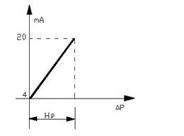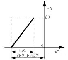 以電動(dòng)差壓變送器為例,當(dāng)液位H為O時(shí),差壓變送器輸出的信號(hào)應(yīng)為4 mA,當(dāng)液位H為*高液位時(shí),差壓變送器輸出的信號(hào)應(yīng)為20 mA,這是一種比較理想狀態(tài)。從圖1可見,當(dāng)被測介質(zhì)的密度為ρ,容器中液體以上部分的氣相并不會(huì)凝結(jié)成冷凝液,這時(shí)作用于變送器正負(fù)壓室的差壓應(yīng)為:△Р= Hρ。其曲線如圖2所示: